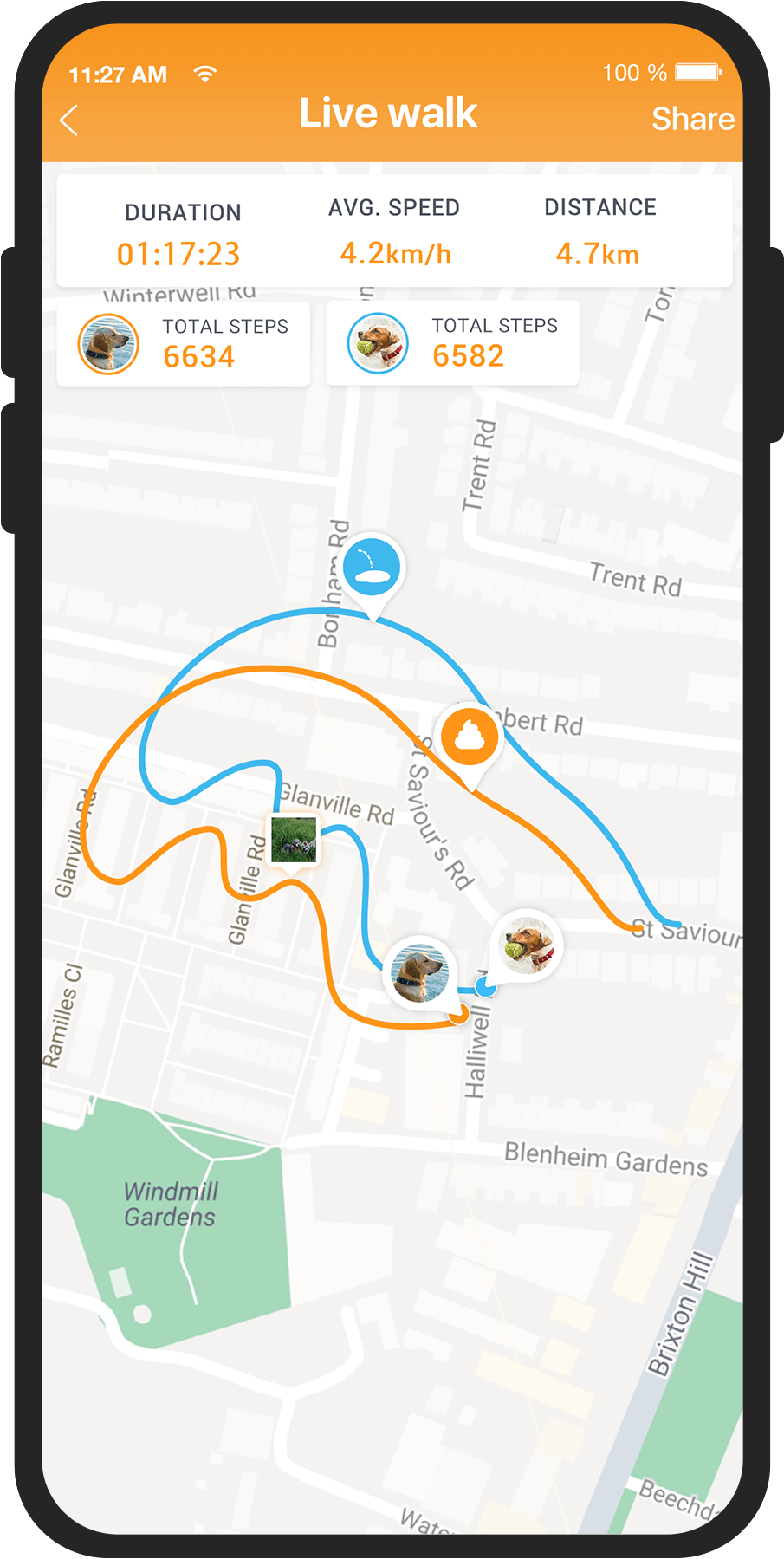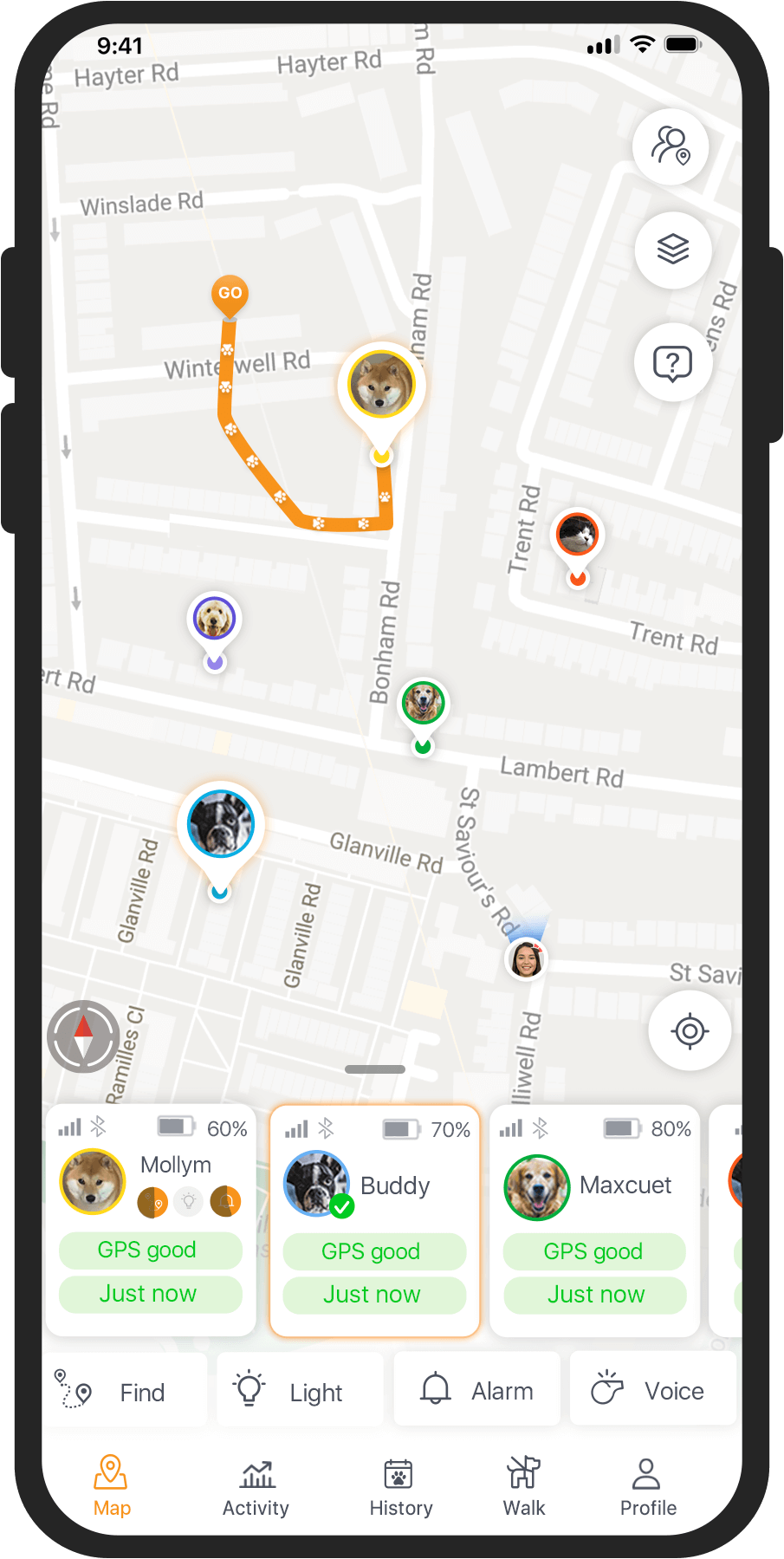 This means we can monitor your dogs activity, and we always know where your dog is, via GPS tracking.